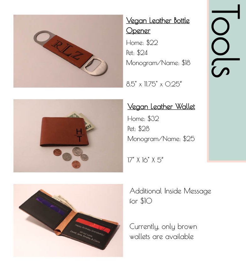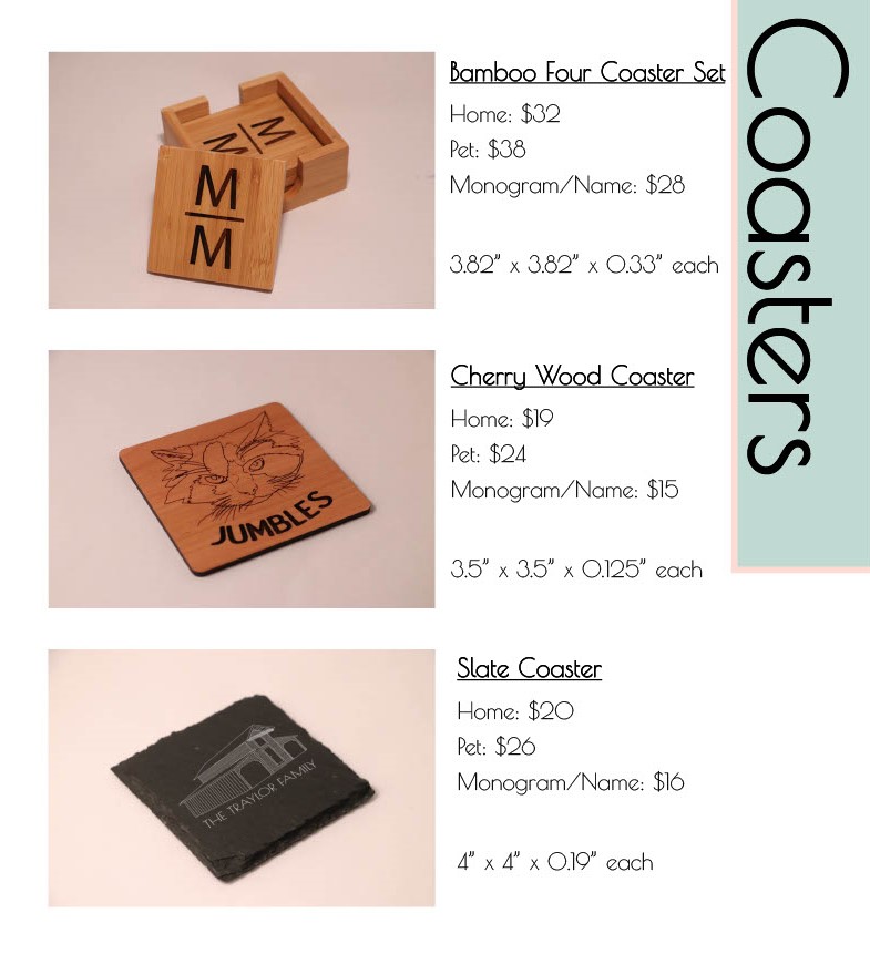 Our catalog contains our current available items for customization. Other custom projects can also be accommodated, so please contact us about any concepts you have! We want to bring your ideas to life!